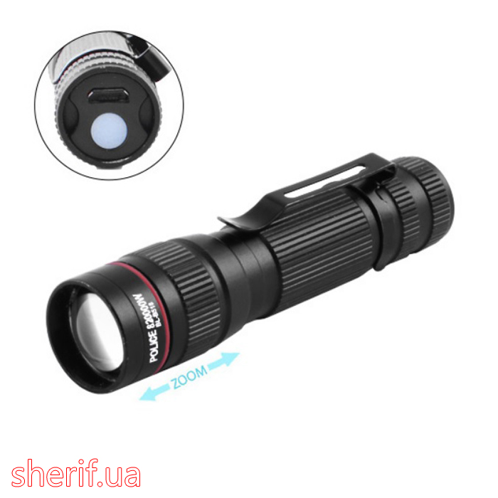 Police Flashlight B518-XPE, micro USB charger, built-in battery, zoom, clip, Box