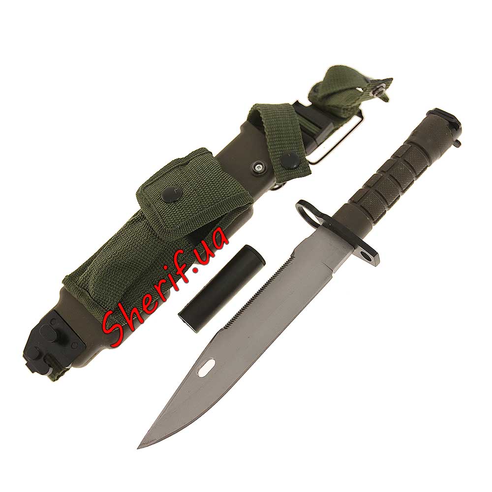 Reproduction by MIL-TEC. M9 (M9 bayonet) - army stick-knife. The blade of the shtika M9 is single-edged, with a file on the butt. The scabbard is plastic, on the end of the scabbard there is a steel slip with a viriz and an oval pin. When the blade is applied with an oval hole on the pin, the stick is transformed into knives for cutting the dart.
