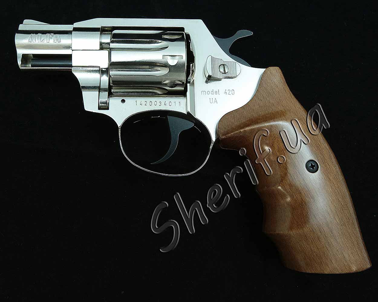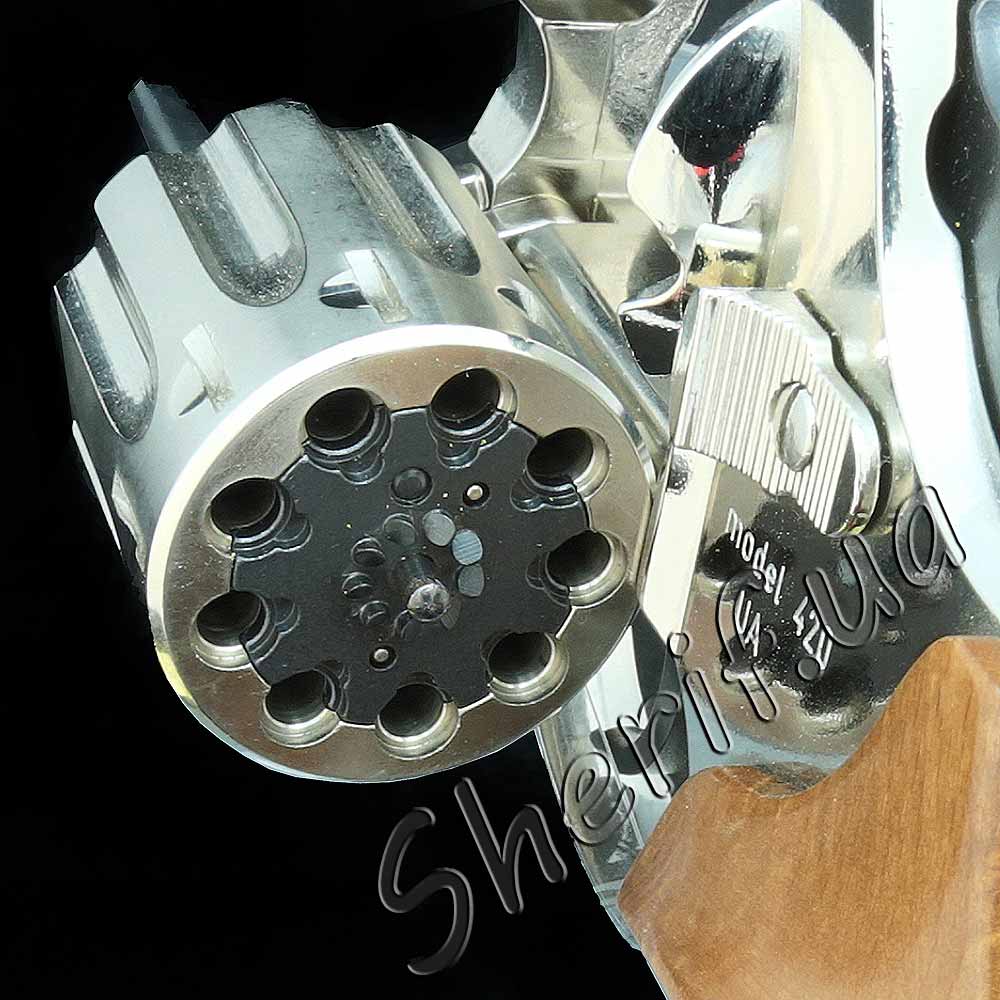 This model will not be missed by any of the highest connoisseurs in the arms world. The designers have provided an unusually elegant design: nickel-plating technology has been introduced in the metal casting of the entire case. This procedure will protect against corrosion, and such a revolver will serve you for many years. To give more nobility to the appearance, it was specially equipped for the convenience of the hands with wooden linings with special cuts for the fingers, which can be easily removed if necessary. The drum with a capacity of 9 ammo is refilled with primers that have uniform pressure and shoot with the same precision and reliability. Buying an Alfa-420 means acquiring a truly real weapon.