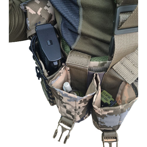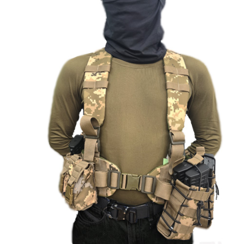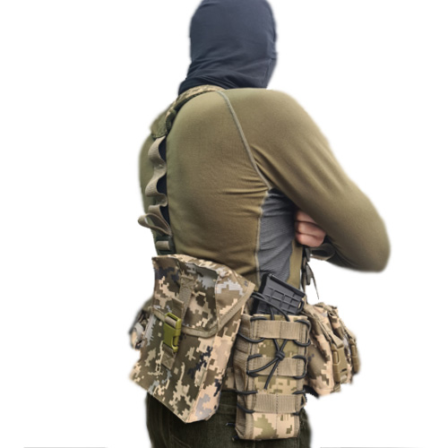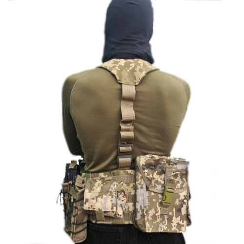The straps expand in the shoulder part for a wider fit. The back strap has a rubber insert for comfort while bending forward. There are also two rows of the MOLLE system along two front pockets of the leather strap.