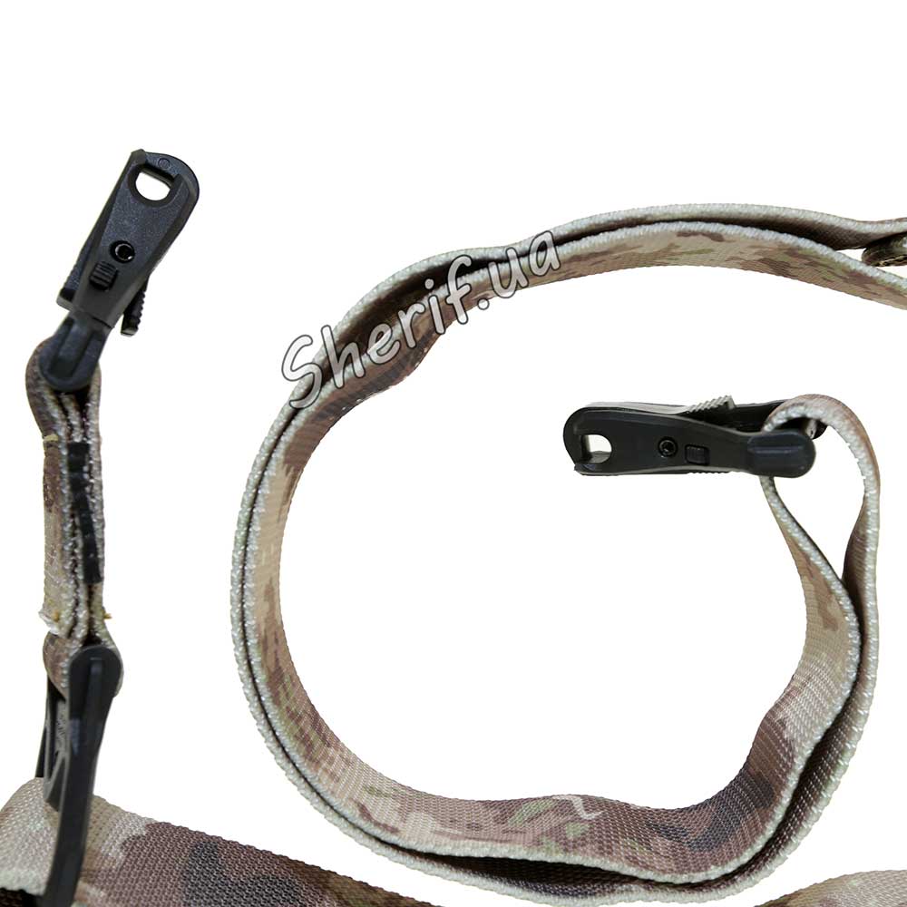 The belt manufacturing material is a nylon strip, quite soft and wide. Fittings are combined, sliding carabiners and a central ring made of impact-resistant ABS plastic, carabiners for suspension consist of twoParts - base made of ABS plastic and latch made of metal. There is a fixation of the latch of the carbine from accidental opening, on the side of the carbine there is a button that locks the latch in the closed position, which guarantees the impossibility of accidentally opening the carbine and protects the weapon from falling.