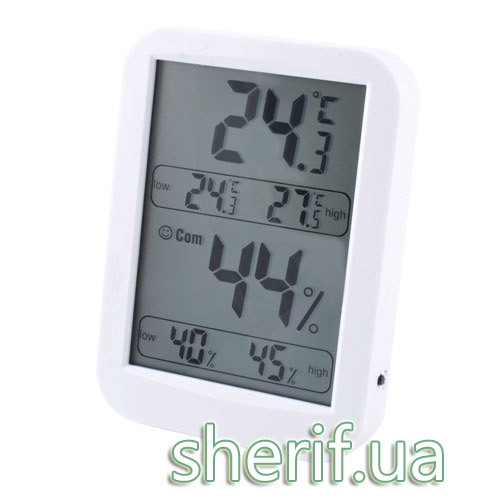 Термометр електронний із гігрометром. Діапазон вимірювання температури: від -10°C до + 70°C (від -14°F до + 158°F) Похибка: 1°C. Діапазон вимірювання вологості: 10% ~ 99% RH. Похибка: 5% RH. Підставка, магнітне кріплення та підвіс для кріплення на стіну.
