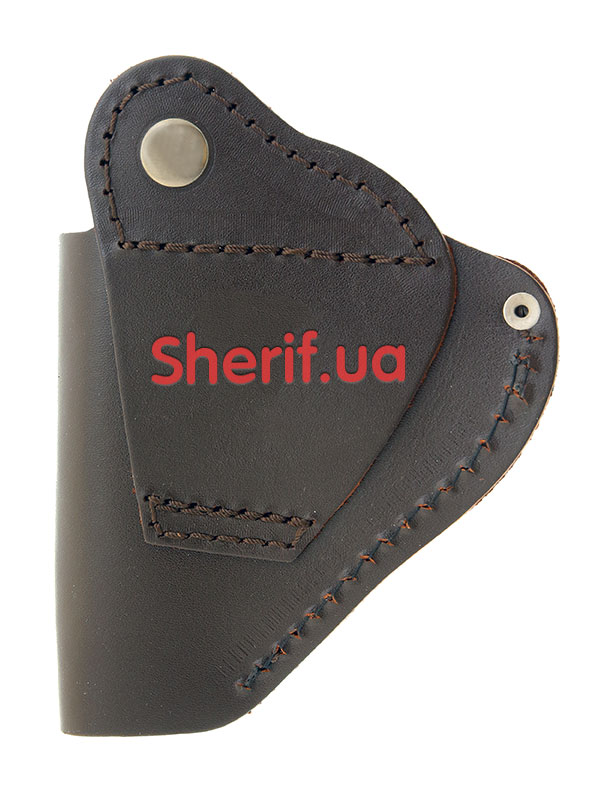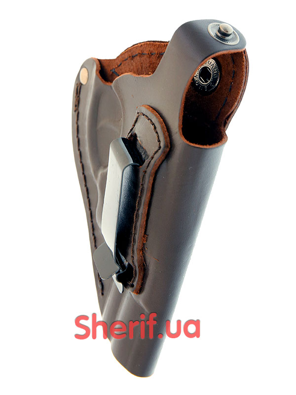 - Ви зможете отримувати зброю максимально швидко . Револьвер утримується у кобурі за рахунок шкіряного ремінця на металевій кнопці. Та й сама по собі конструкція чохла на основі формованої шкіри сприяє більш щільній фіксації зброї. Навіть якщо ремінець розстебнутий, револьвер навряд чи випаде при нахилях. Кнопка розкривається великим пальцем до тіла, що дуже зручно. Її відповідна частина погружена в шкіру хлястика і не заважає виймати револьвер.