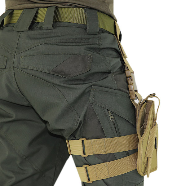 - Вас здивує зручність звернення . Передбачено блискавичне кріплення на стегні завдяки фастексам, а також можливість швидко відрегулювати довжину ременів, що охоплюють ногу. Важливо, що кобура не стискає ногу, а щільно охоплює її завдяки еластичним вставкам на ремінцях. По висоті виріб також регулюється, кріпиться зверху на поясний ремінь – за допомогою підвіски на липучці та фастексі.