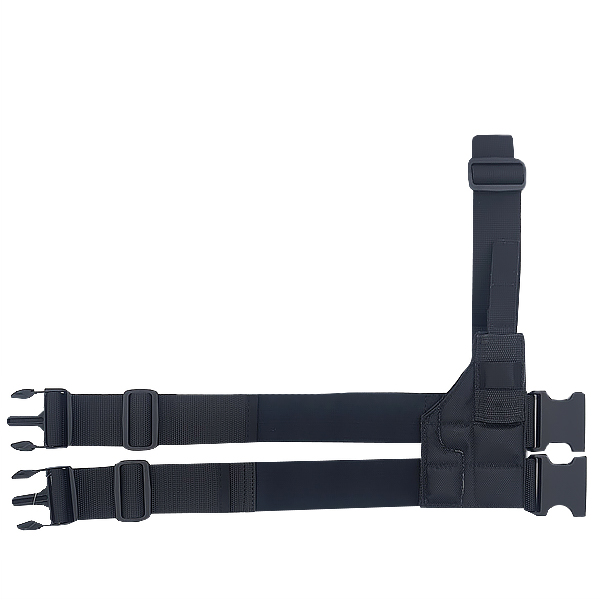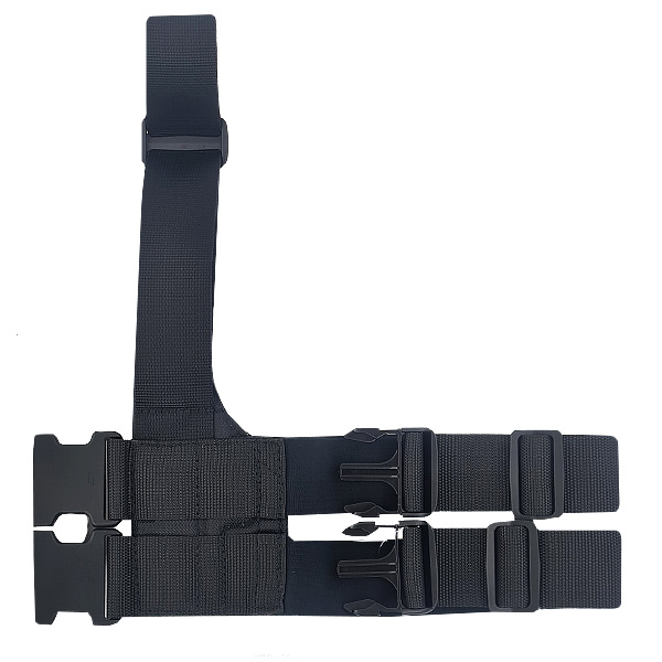 Кобура тактична надійно кріпиться до пояса за допомогою кроквяного ремінця. Обхват стегна забезпечують дві широкі гумки з елементами стропи, які застібаються потужними карабінами типу Fastex.
