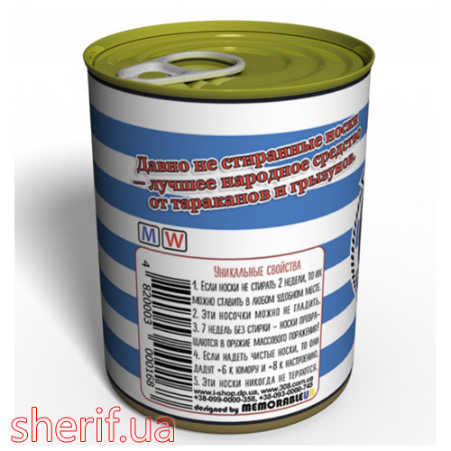 Відпочиваючи в Одесі, хочеться привезти від туди якийсь сувенір. Це може бути звичайний магніт на холодильник, тільник з написом Одеса, кашка з принтом або ще якась дрібничка. Ми вигадали новий та оригінальний сувенір з Одеси, який викличе здивування позитивні емоції - Чисті консервовані шкарпетки Одесита. Такий подарунок з Одеси припаде до душі кожному, адже це незвичайно, креативно та весело. А також самі шкарпетки будуть корисними в побуті.