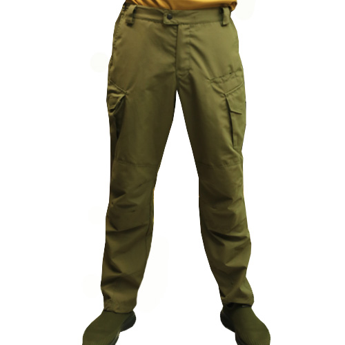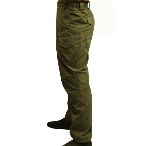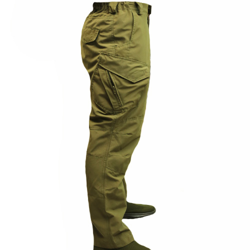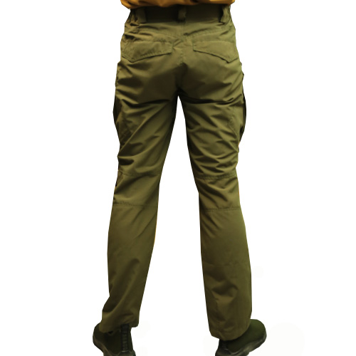 Тактичні штани мають дві передні прорізні кишені і дві задні кишені, що знаходяться під кутом для зручного доступу до спорядження. У підстави даних кишень розташовані накладки з основного матеріалу, які запобігають зносу кишені під час носіння спорядження (ножа, ліхтаря тощо) на кліпсі. Дві обідні стегнові бічні кишені на застібці "липучка". Коліна та область сидіння посилені другим шаром тканини.