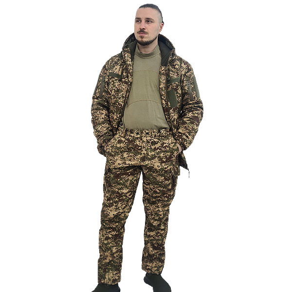 Колір - це ретельно підібраний мікс відтінків бежевого, пісочного, зеленого та темно-коричневих піксельних плям різних розмірів. Це сучасна українська розробка камуфляжу.