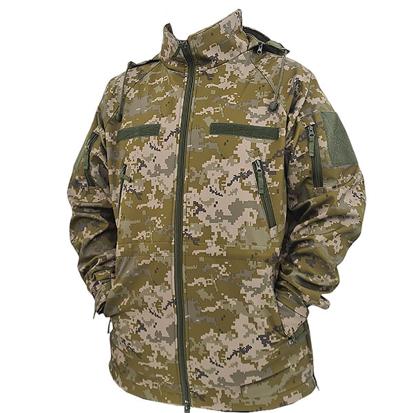 Зовнішні кишені військової куртки Софт Шелл : косий нагрудний з блискавкою, дві нижні врізні для рук і по одному вертикальному на кожному плечі, які також закриваються блискавкою. На рукавах є широкі панелі велкро (4" х 4") для шевронів . Усередині нашіті 2 кишені (1 на блискавці під документи або гроші та 1 на велкро з протяжкою для навушників).