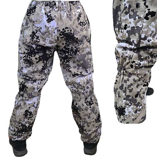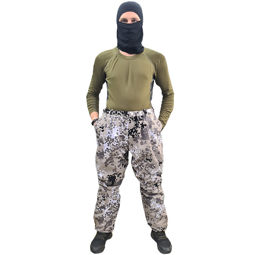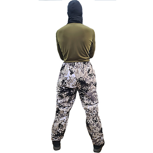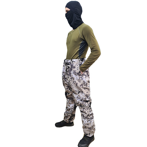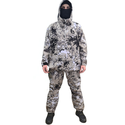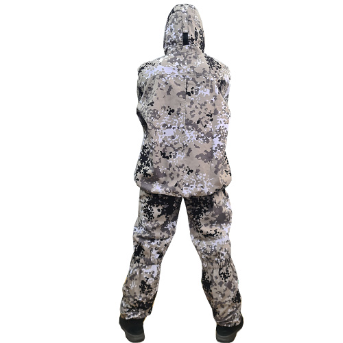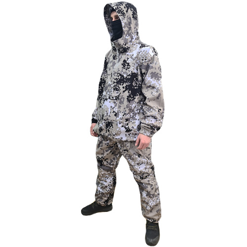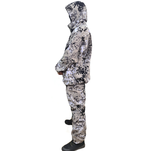 - Легко надягається, не заважає при пересуванні, у тому числі поповзом або крізь кущі . Костюм спеціально викроїли вільним, мішкуватим, щоб легше було натягувати поверх верхнього одягу. Він складається з куртки та штанів. Їх можна носити окремо, поєднувати з іншими відповідними кольорами елементами маскування. Куртка надягається через голову, спереду розстібається до середини куртки на блискавку. Спереду є карман на липучці. Знизу куртка за бажанням затягується шнурівкою для більш щільного прилягання до тіла. У манжети рукавів вставлені резинки.