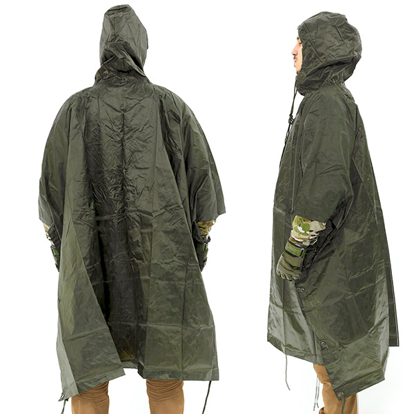 Матеріал Rip Stop, з якого виконано пончо, виготовляється за спеціальною технологією - на однаковій відстані один від одного вплітаються міцні нитки для зміцнення структури тканини. Ріпстоп не дозволяє дрібним порізам та проривам розходитися далі. До того ж він не пропускає повітря і вологу, а поліуретановий шар посилює водонепроникність. Виходить, що зносостійкість виробу підвищується, не обтяжуючи його, в т.ч. год. при намоканні.