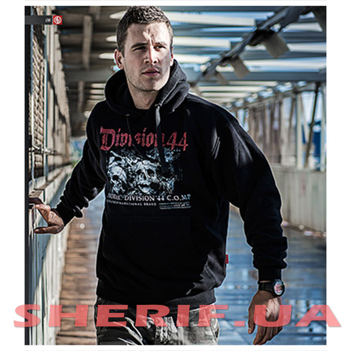 Класична толстовка, що одягається через голову та оброблена трикотажною гумкою. Толстовка виготовлена з якісної бавовняної тканини щільністю 320 г. Червоні деталі у вигляді внутрішньої облямівки, а також лейбла, вшитого в бічний шов. У центрі грудної клітки картинка з двома лежачими черепами та написом Nord Division 44 COMP Вище принт з найменуванням колекції. Використовується готичний червоний шрифт. На шиї є невеликий логотип у вигляді штампу.