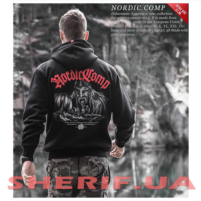 Толстовка з малюнком у готичному стилі. На спині — великий принт із персонажем вікінга та флотом драккарів на схвильованому морі. Вище - опуклий напис "Nordic Comp". Окремі літери були вшиті на додатковому матеріалі. На лівих грудях – невеликий кельтський символ. Над ним - напис "Nordic", вишита прямо на матеріалі. Вишивка червоного кольору. Толстовка виготовлена зі 100% бавовняної тканини щільністю 320 г/кв.м, виконана міцними трикотажними гумками. Має високу стійку і дві приховані кишені. Модель з блискавкою. Усередині — червоне пліссе та великий кольоровий ярлик із мотивом орла.