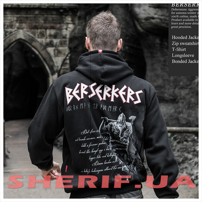 Толстовка чоловіча, виготовлена зі стовідсоткової бавовняної тканини вагою 320 г/кв.м. Модель із блискавкою та двома кишенями, оброблена широкими трикотажними гумками. При шиї – додатково – внутрішня обшивка. На боці — фірмовий лейбл із логотипом марки. Високо на спині — великий червоно-білий принт Berserkers. Нижче — графіка в скандинавському стилі з персонажем вікінга-воїна, що несе сокиру, та рунічних символів. Найменування колекції повторено на лівих грудях у вигляді одноколірної вишивки, виконаної прямо на матеріалі.