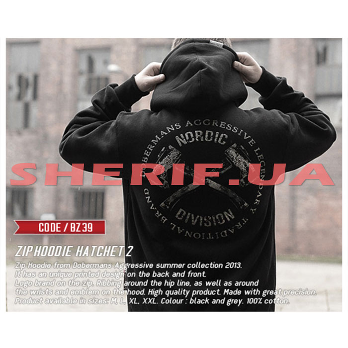 Толстовка виготовлена з чистої бавовни щільністю 320 г. Класична модель оброблена трикотажною гумкою. Має блискавку та високий комір-стійку. Капюшон має сірий лейбл і шнурки з металевими обмежувальними кільцями. Спереду - дві накладні кишені. Спина прикрашена великою, однотонною графікою, що зображує дві перехрещені сокири. По колу напис Dobermans Aggressive Legendary Traditional Brand. Принт у вигляді штампу. На лівих грудях повторюється той самий логотип розміром менше.