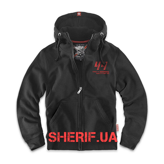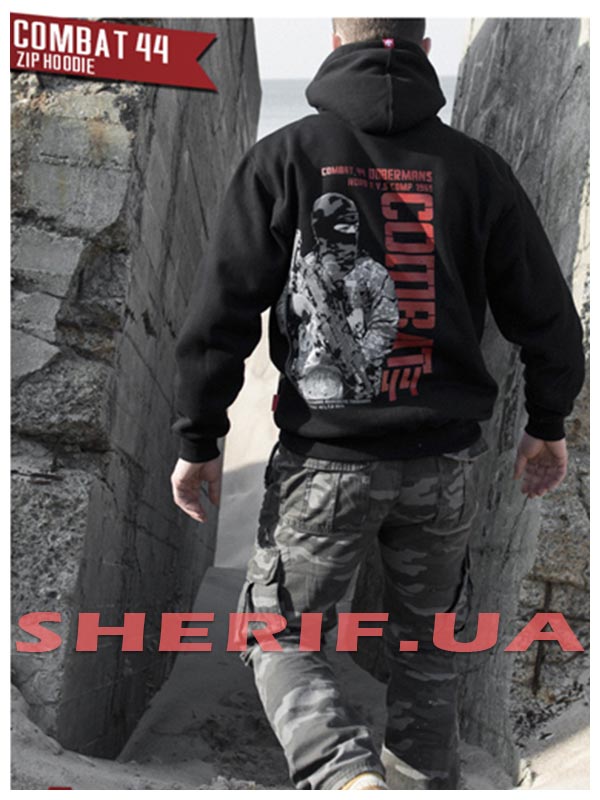 Толстовка у стилі мілітарі з колекції Combat. На лівих грудях символ 44 і найменування марки На задній стороні триколірна графіка із зображенням десантника. Уздовж правого шва – великий вертикальний принт червоного кольору з написом Combat та число 44. Стиль мілітарі. Толстовка застібається високо під шию та оброблена широкими трикотажними резинками. Має каптур зі шнурками та дві накладні кишені. У бічний шов толстовки та в шов капюшона вшиті червоні лейбли з логотипом марки. Внутрішня частина і великий кольоровий етикетку з символом орла. Толстовка виготовлена з бавовняної тканини щільністю 320 г.