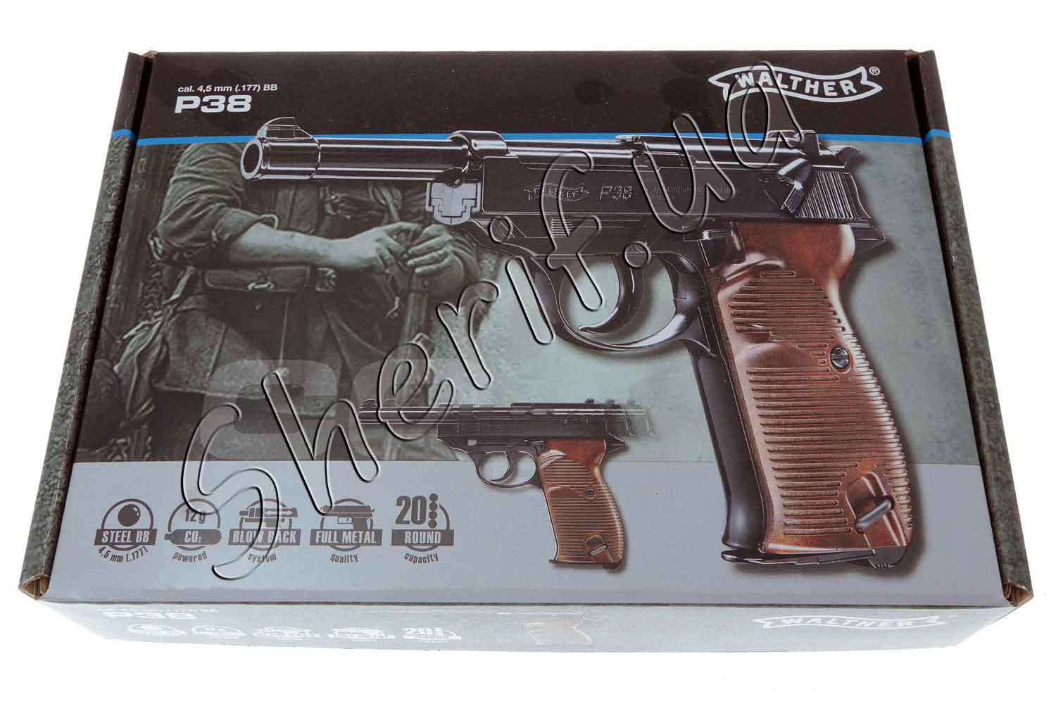 - Ви станете володарем копії легендарного пістолета. Серед шанувальників пневматики репліка пістолета Walther P-38 має великий попит. Оригінальна зброя, за зразком якої виготовлялася ця модель, була прийнята на озброєння Німеччиною з 1938 р. і набула найбільшого поширення в період Другої світової війни. Глянцеве покриття чорного кольору, стилізовані накладки під дерево виглядають респектабельно. Такому трофею позаздрить будь-який солдат.