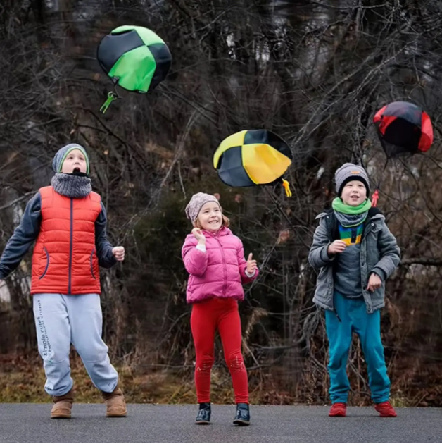 Яскраві парашутисти для активної гри на вулиці! У наборі три парашутисти з кольоровими куполами (зелений, жовтий, червоний), які красиво ширяють у повітрі після запуску. Просто киньте їх високо вгору — і дивіться, як вони плавно спускаються вниз.