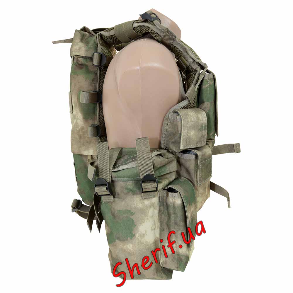 Передня частина розвантаження регулюється та застібається за допомогою двох ременів та обтяжених затискачів типу «тризуб» (fastex). Є можливість кріплення поясного ременя.