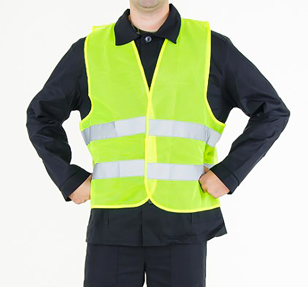 Сигнальний жилет з поліестру люминисцентного кольору з широкими поперечними світловідбиваючими (світлоповертаючими) смугами, V-подібним вирізом і центральною застібкою на липучки.
