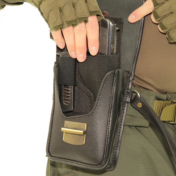 Сумка комплектується знімною вкладкою, яка містить дві кишені: для зброї та запасного магазину до неї. Розміри кобури підігнані під параметри пістолета із серії ФОРТ, що гарантує надійну фіксацію зброї при перевертанні футляра.