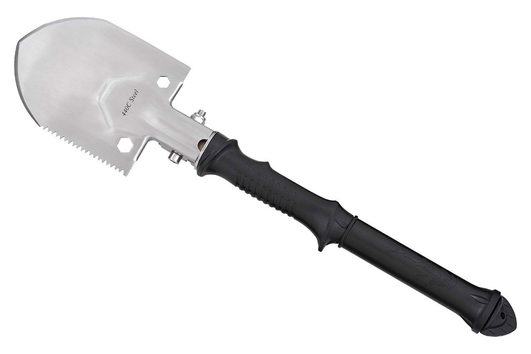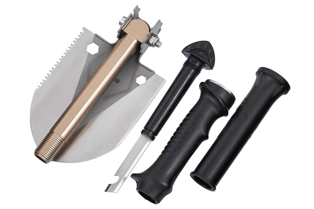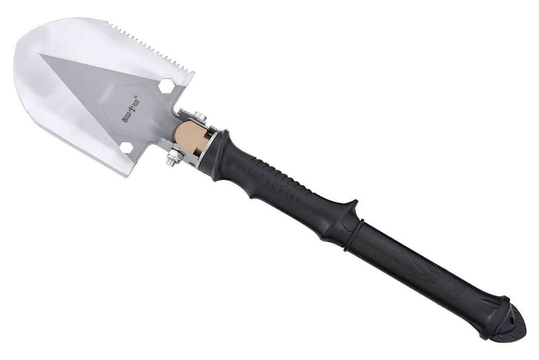 - У порожній рукояті лопатки знаходиться ніж, який також можна використовувати Ніж фіксується на різьбовому з'єднанні, тому не випаде з рукояті навіть під час активного використання лопатки за призначенням.