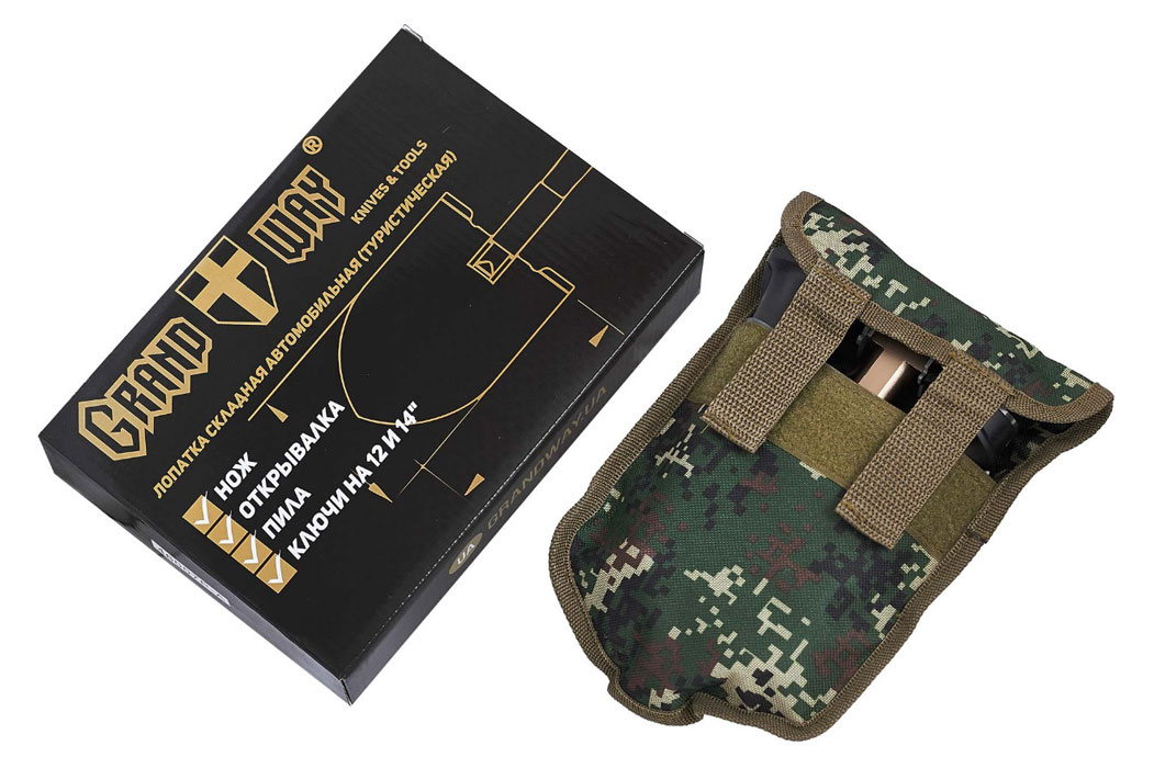 У розібраному стані лопатка-мультитул Grand Way 46007 PA займає зовсім небагато місця. Вона легко поміститься у багажнику автомобіля або у ящику для інструментів. При необхідності на штик лопатки можна надіти чохол із щільної тканини на кшталт кордури, що продається разом з нею. Чохол міцно закривається на застібки-липучки, а також має шльовки для кріплення на поясному ремені.