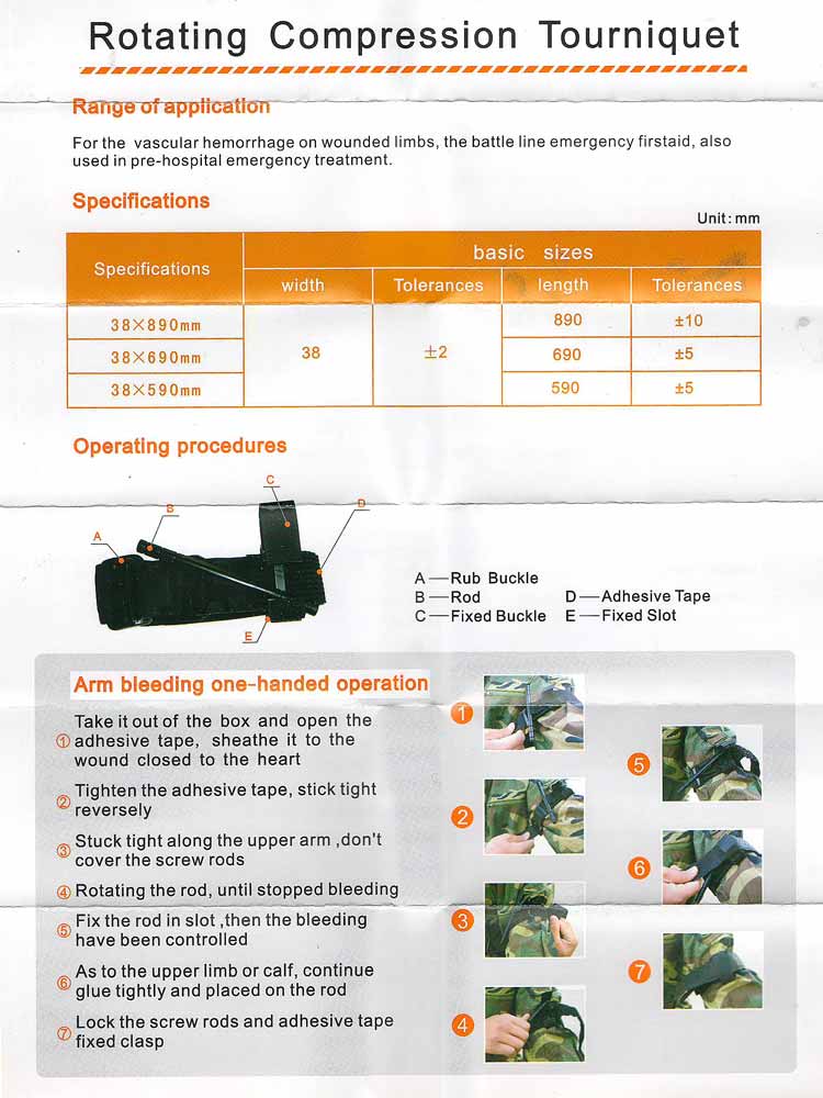 Tourniquet is a first aid item. It is used to temporarily stop a hemorrhage until the wounded person is taken to an emergency room or hospital. They are applied just above the wound in order to compress the blood flow in the arteries and not injure the nerve trunks. The product should not be on the limb for more than 2 hours.