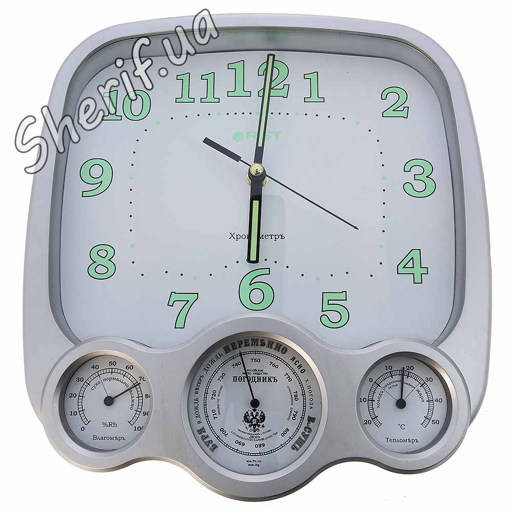 МетеоГодини настінні з Барометром і ТермоГігрометром, 270х275х50мм, плавний хід стрілок, сріблястий корпус. Подарункова, сувенірна, презентабельна упаковка: глянсовий картон, кольоровий друк.