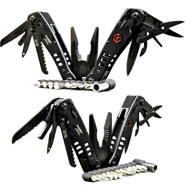 Інструменти: плоскогубці, кусачки, ножиці, ніж з прямим мечем, пила, стропоріз, тримач для насадок, консервний ніж, ключ для відкривання пляшок, інструмент для зняття ізоляції, шило з петлею, плоска викрутка, 11 біт