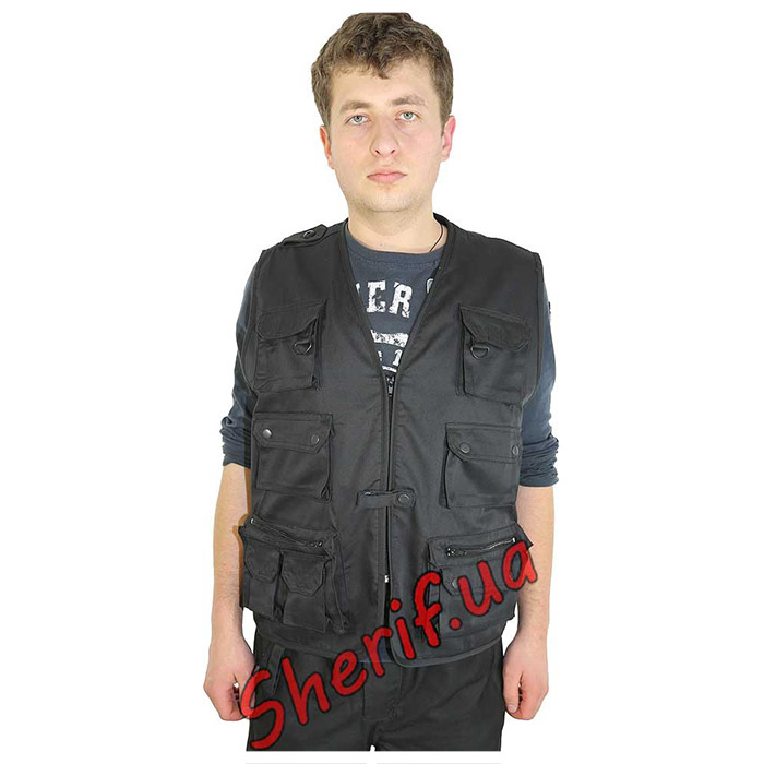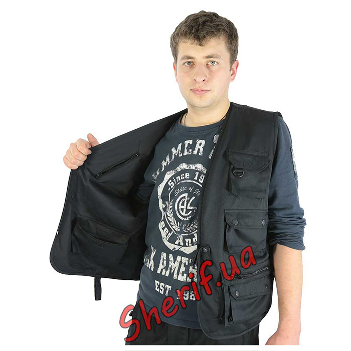 Чорний стильний жилет має 14 кишень, які можуть вмістити в себе від будь-якого невеликого рибальського аксесуара до солідних розмірів GPS. Їх можна застебнути блискавкою, ременями чи липучками.