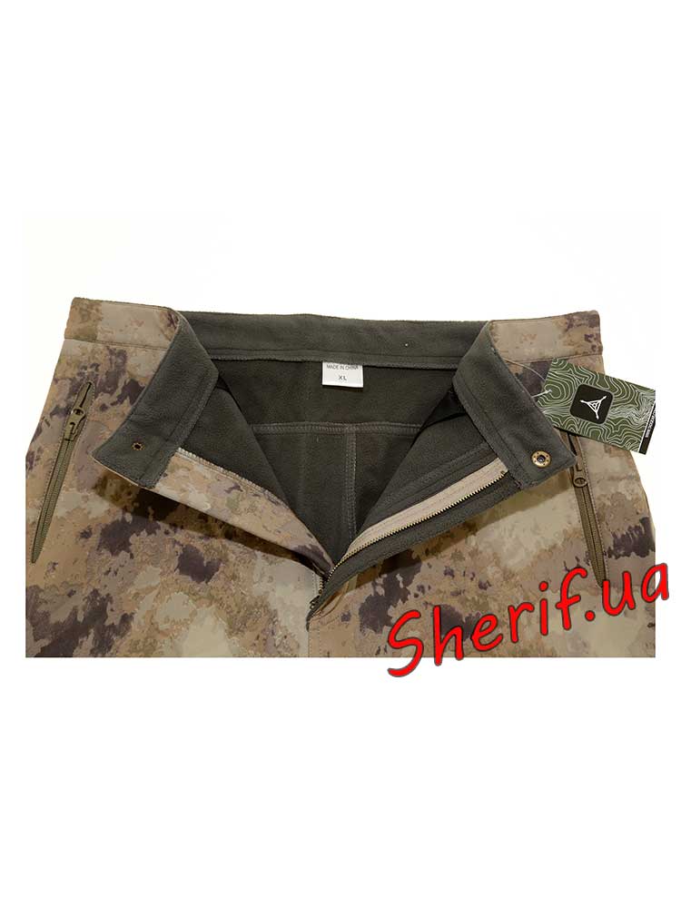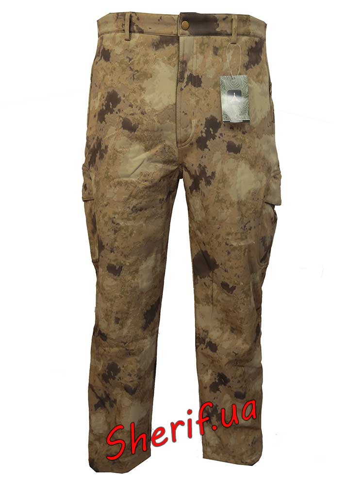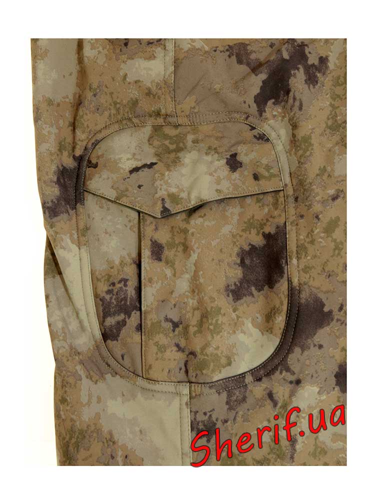 Штани виготовлені з використанням композитного матеріалу Шаркскін Софтшелл. Штани для камуфляжної форми дуже легкі та м'які. Для забезпечення найкращої продуктивності штани варто надягати поверх термобілизни . Таке носіння гарантує захист від вітру та дощу, виведення вологи від тіла через мембрану . У цих камуфльованих штанів є безліч зручних відділень, наприклад, доступні бічні кишені. Штани добре тягнуться, але не розтягуються, тому це добрий вибір також і для активного відпочинку. Ширинка застібається на блискавку.